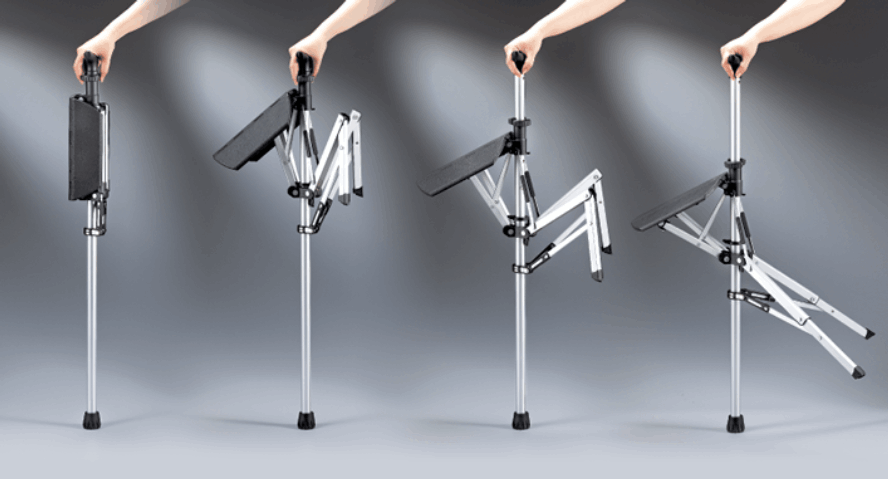 Automatic Deploy to seat with just two fingers, Folding Seat * 3-panel and curved design ergonomically fits users of all shapes and size * Flexible seat allows for long periods of sitting Auto Leg-Lock Device.