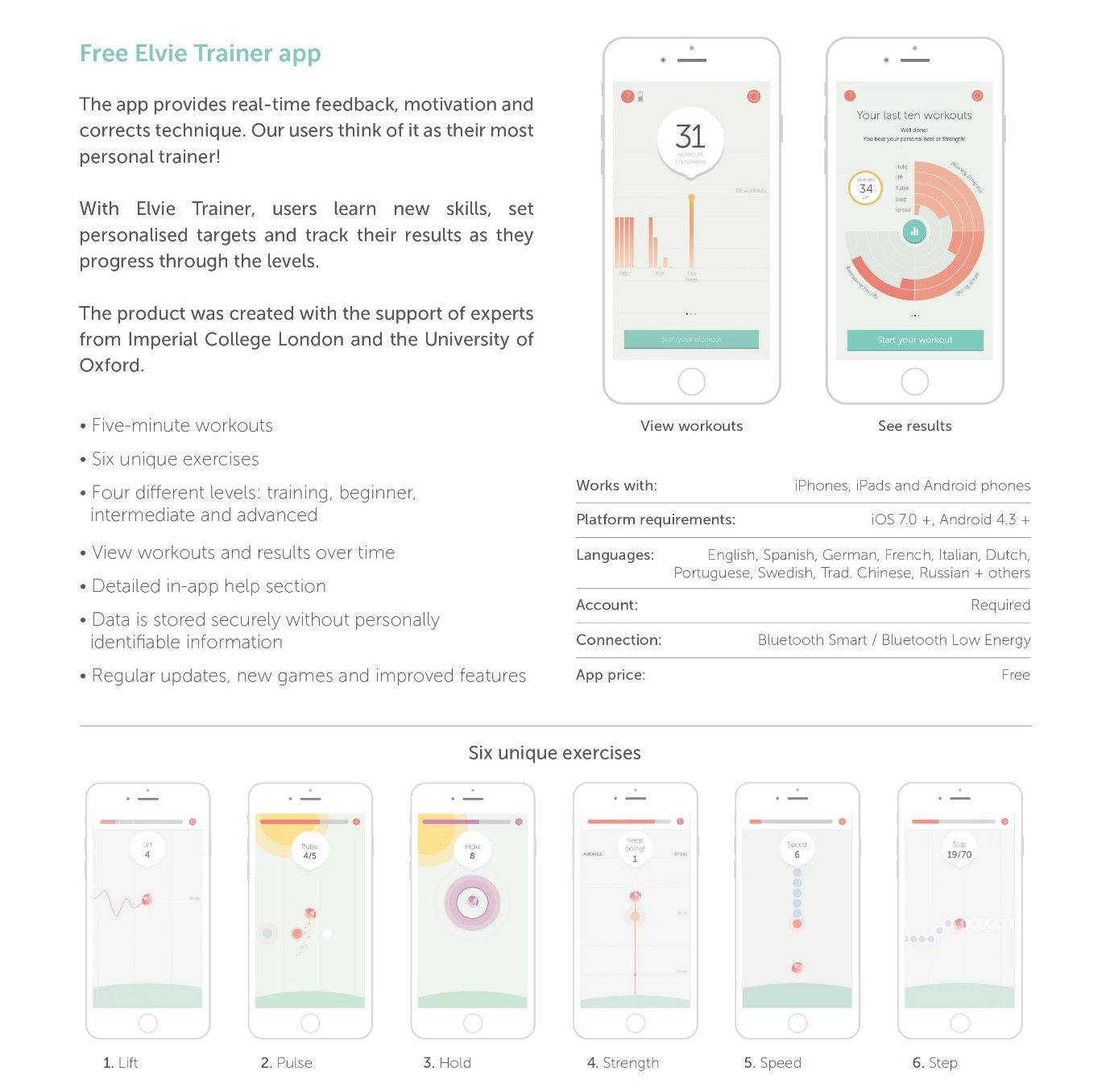 connects to an app, guiding her through fun, fiveminute workouts. Elvie Trainer’s force and motion sensors measure pelvic floor muscle contraction and relaxation. The app allows the user to visualise the exercises in real time and tells her if she’s contracting incorrectly. Working out the pelvic floor has never been so fun and easy!