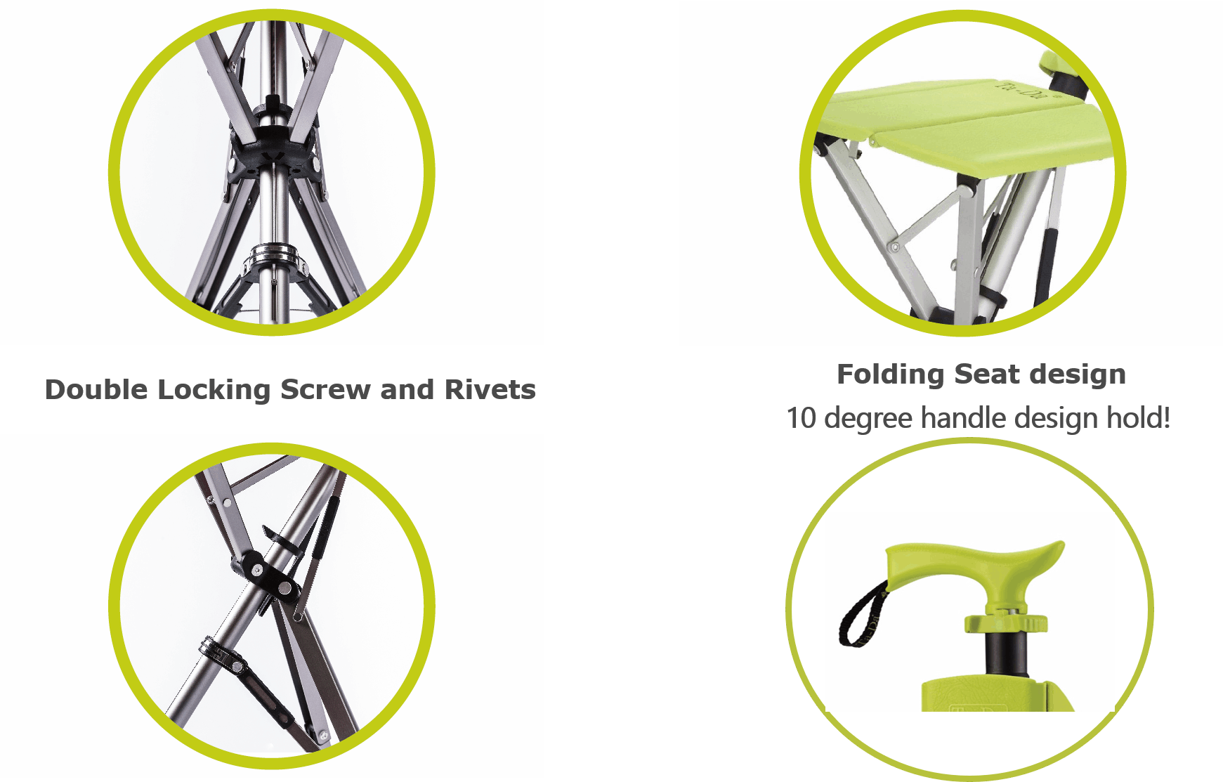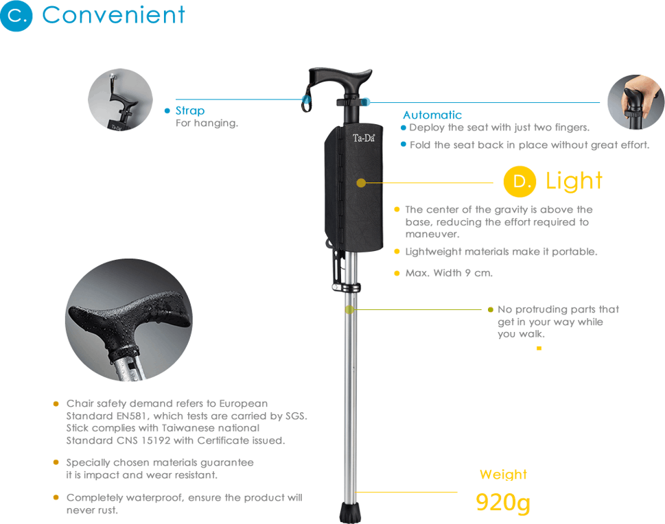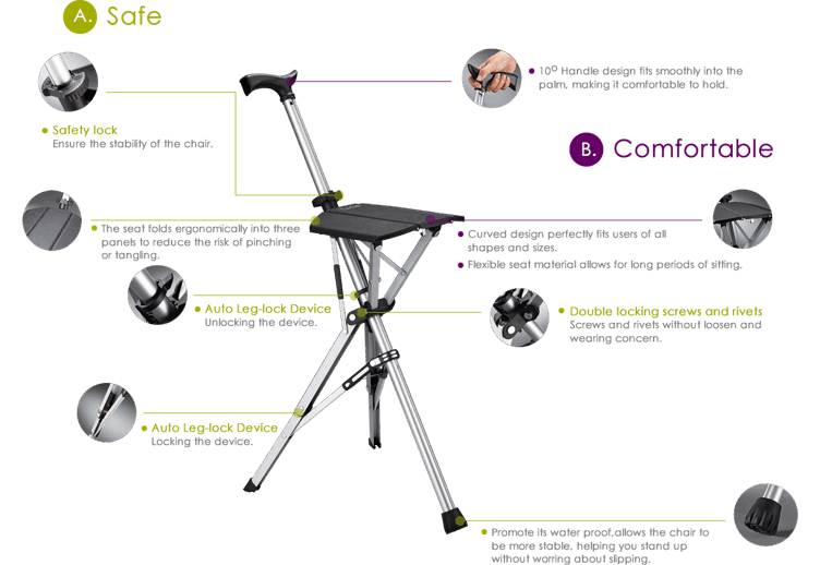 Automatic Deploy to seat with just two fingers, Folding Seat * 3-panel and curved design ergonomically fits users of all shapes and size * Flexible seat allows for long periods of sitting Auto Leg-Lock Device